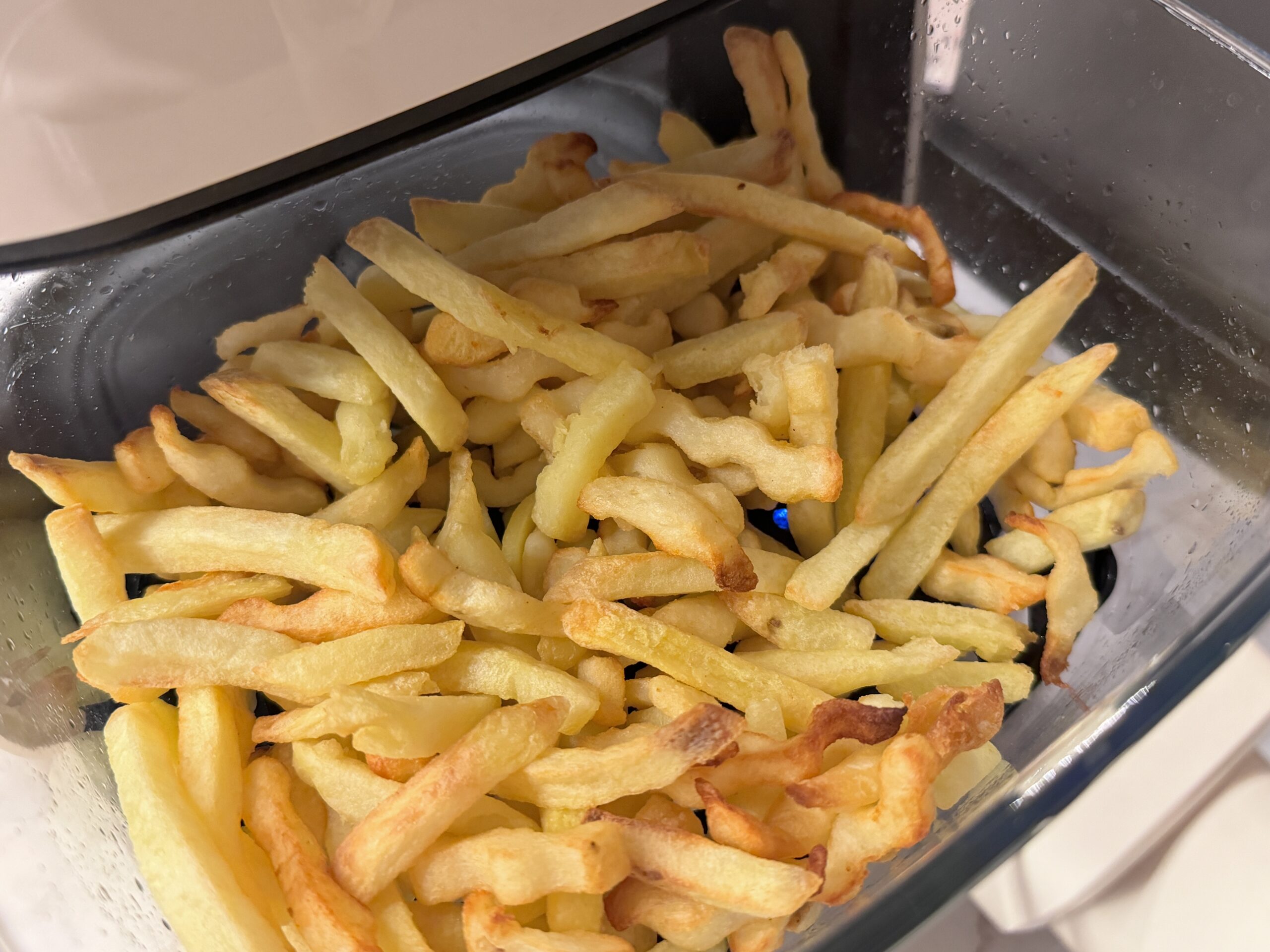 Il sistema di cottura a 360 gradi della friggitrice funziona bene, anche se rispetto ad altri modelli della stessa fascia di prezzo ha tempi di cottura più lunghi a causa delle guarnizioni più morbide e della maggiore dissipazione di calore del vetro. Nonostante tempi di qualche minuto più lunghi, le cotture che si ottengono sono di alta qualità e ci permettono di cucinare cibi sani e con poco olio in maniera semplice e veloce. Nel mio caso ho fatto un uso abbondante della friggitrice andando a cuocere pane, brioches, carne, pesce, verdure e molto altro, in tutti i casi sono riuscito ad ottenere le cotture desiderate senza problemi. Si comporta bene anche con le patate fritte che sono risultate croccanti all’esterno e morbide all’interno, ma hanno richiesto oltre 20 minuti di cottura, un po’ oltre la media. Il limite principale è legato alla capacità del cestello di 4 litri che la rende adatta ad una famiglia di una o due persone.