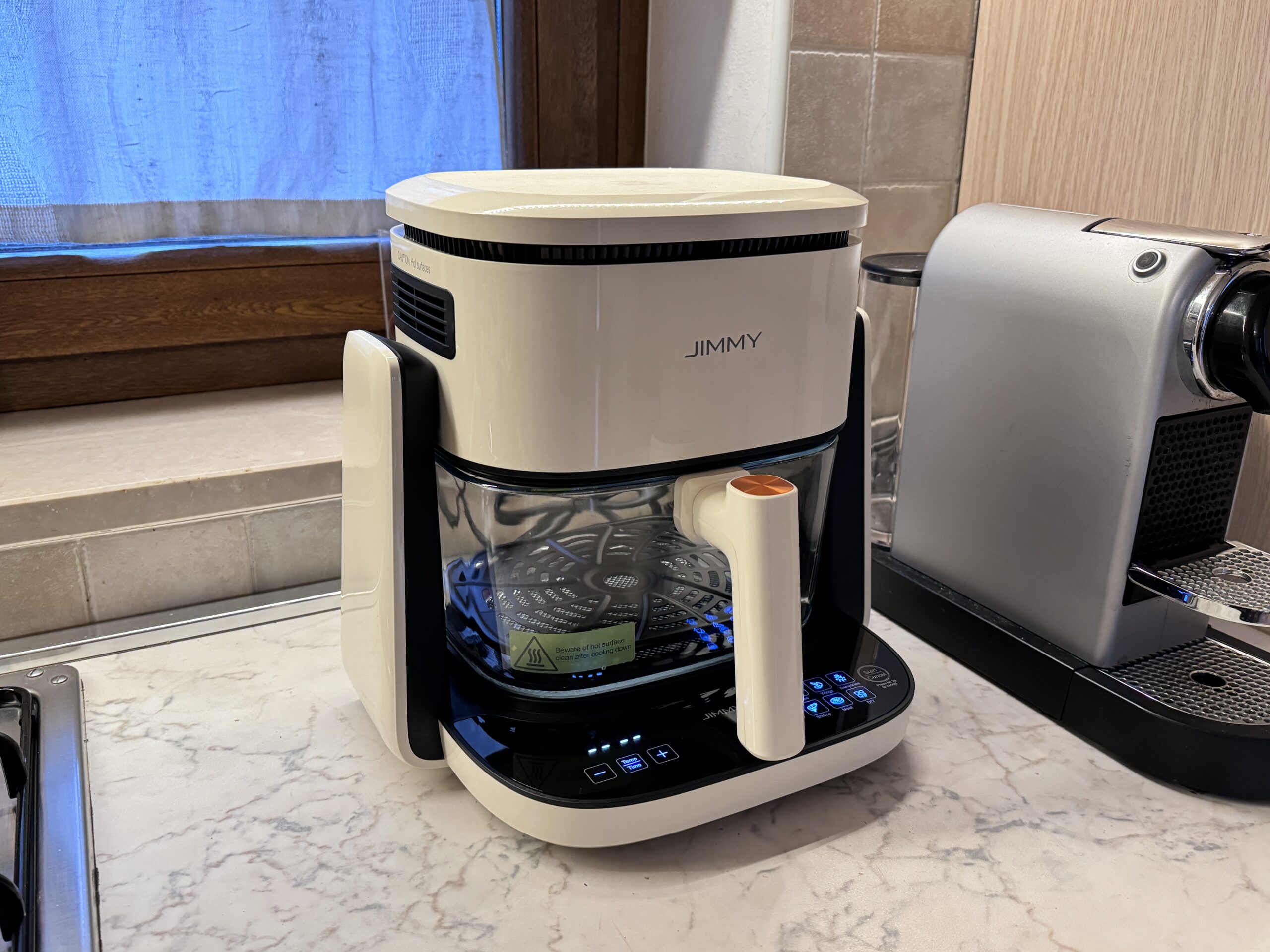 Il funzionamento della Jimmy Af3 è basato su un motore da 1100W di potenza nominale che riesce ad cuocere i nostri cibi con una temperatura variabile fra i 50 e i 200° in modalità friggitrice e i 150 e 220° in modalità griglia/padella.