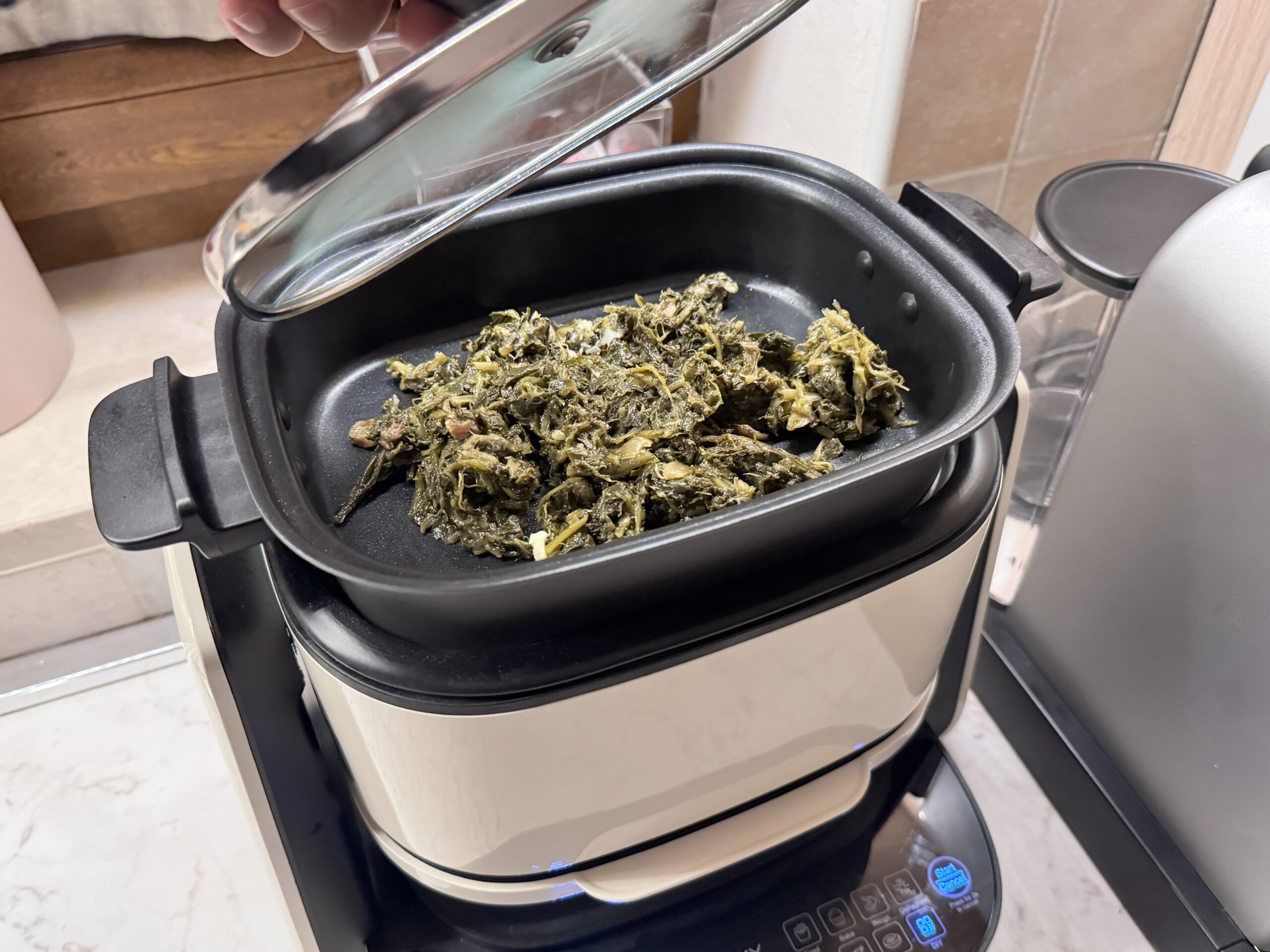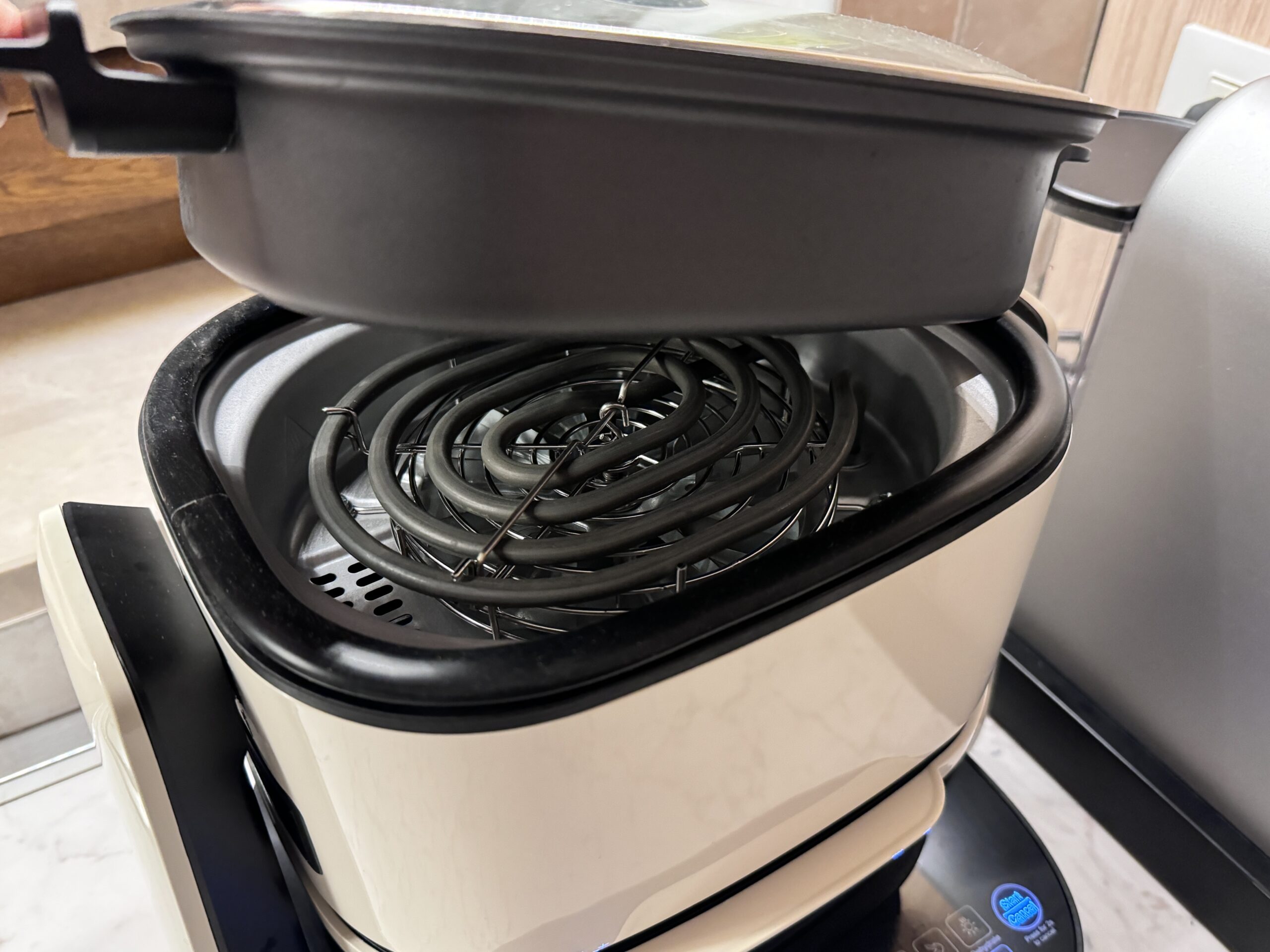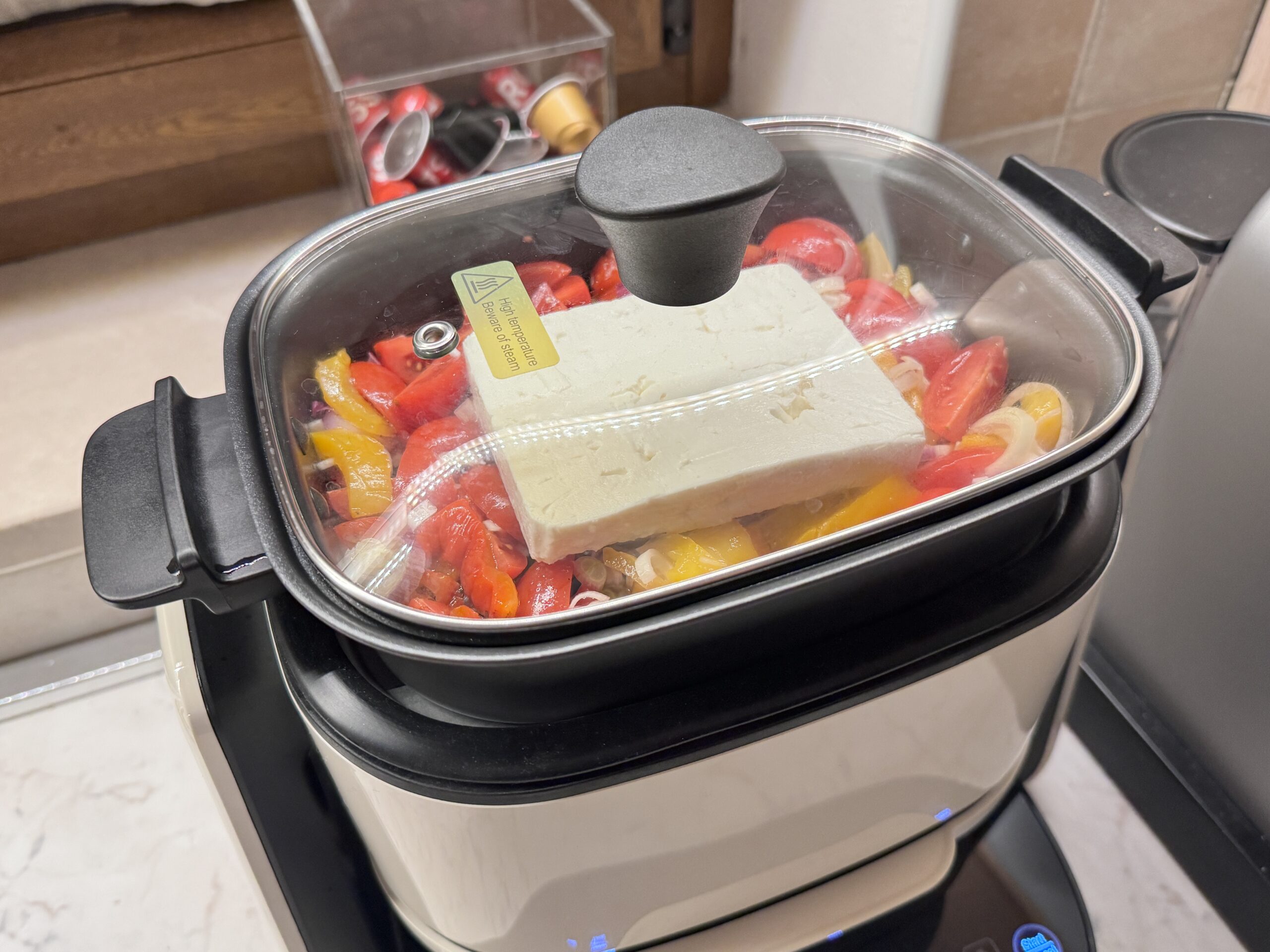 Il cestello in vetro borosilicato ha una capacità di 4 litri, ha quindi una capienza adatta a preparazioni per una o due persone, e ci da il grande vantaggio di poter controllare lo stato di avanzamento della cottura senza dover aprire il cassetto, come accade invece nella quasi totalità dei modelli oggi in commercio, ed evitare quindi di disperdere inutilmente calore. La realizzazione in vetro mi ha convinto e la trasparenza torna davvero comoda, ma la tenuta delle guarnizioni è inferiore rispetto a modelli della stessa fascia di prezzo e la dispersione del calore maggiore rispetto ai modelli in metallo, dettagli che allungano leggermente i tempi di cottura di alcune pietanze.